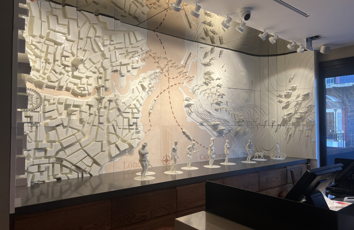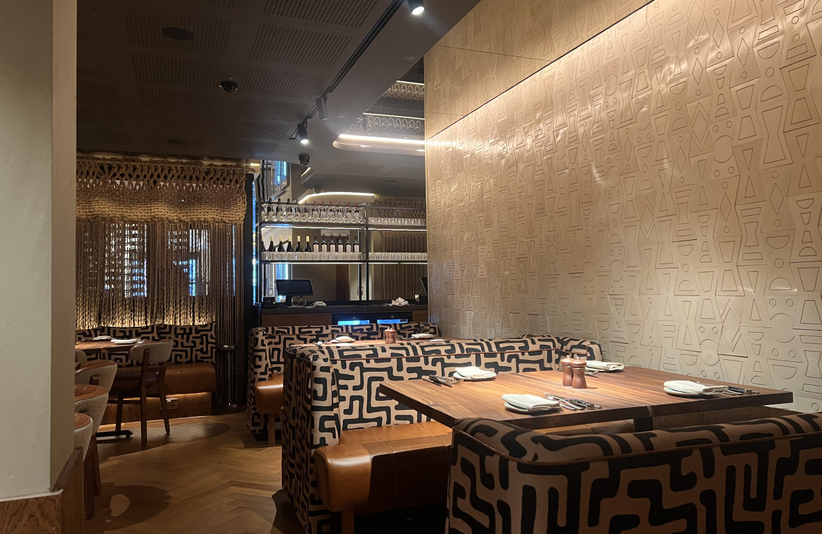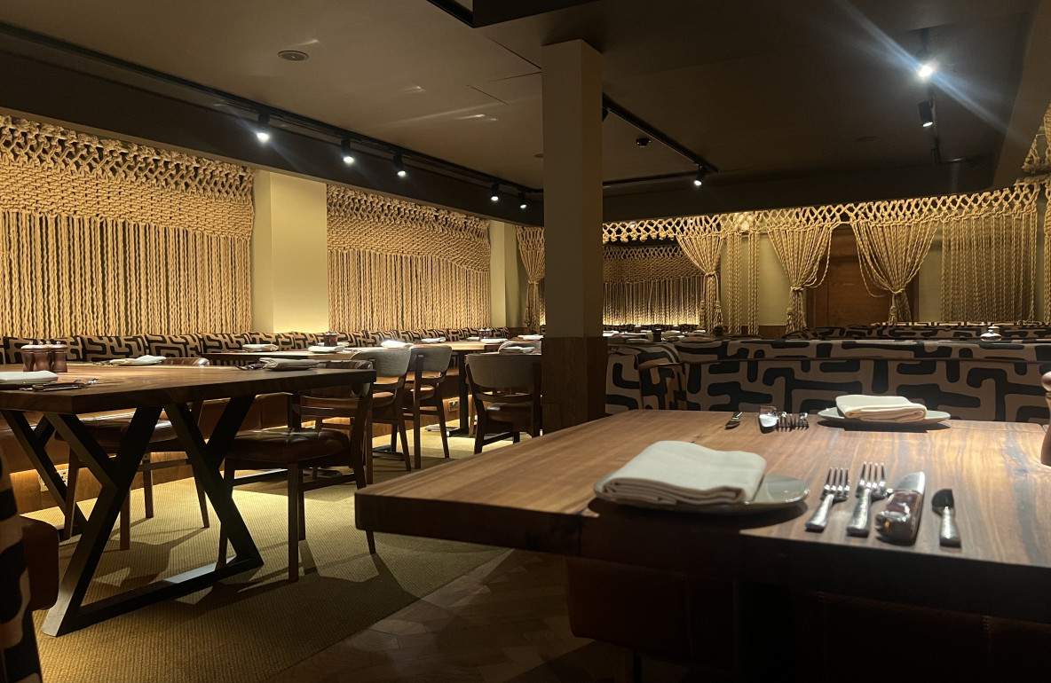 The restaurant’s interior balances warmth and elegance. A signature feature throughout the dining areas is the use of braided rope wall finishes, adding texture and visual interest while reflecting the restaurant’s contemporary yet rugged steakhouse identity. Complementing the rope detailing, ECSEC Ltd installed tailored seating, and feature lighting, creating a cohesive and immersive environment for diners.